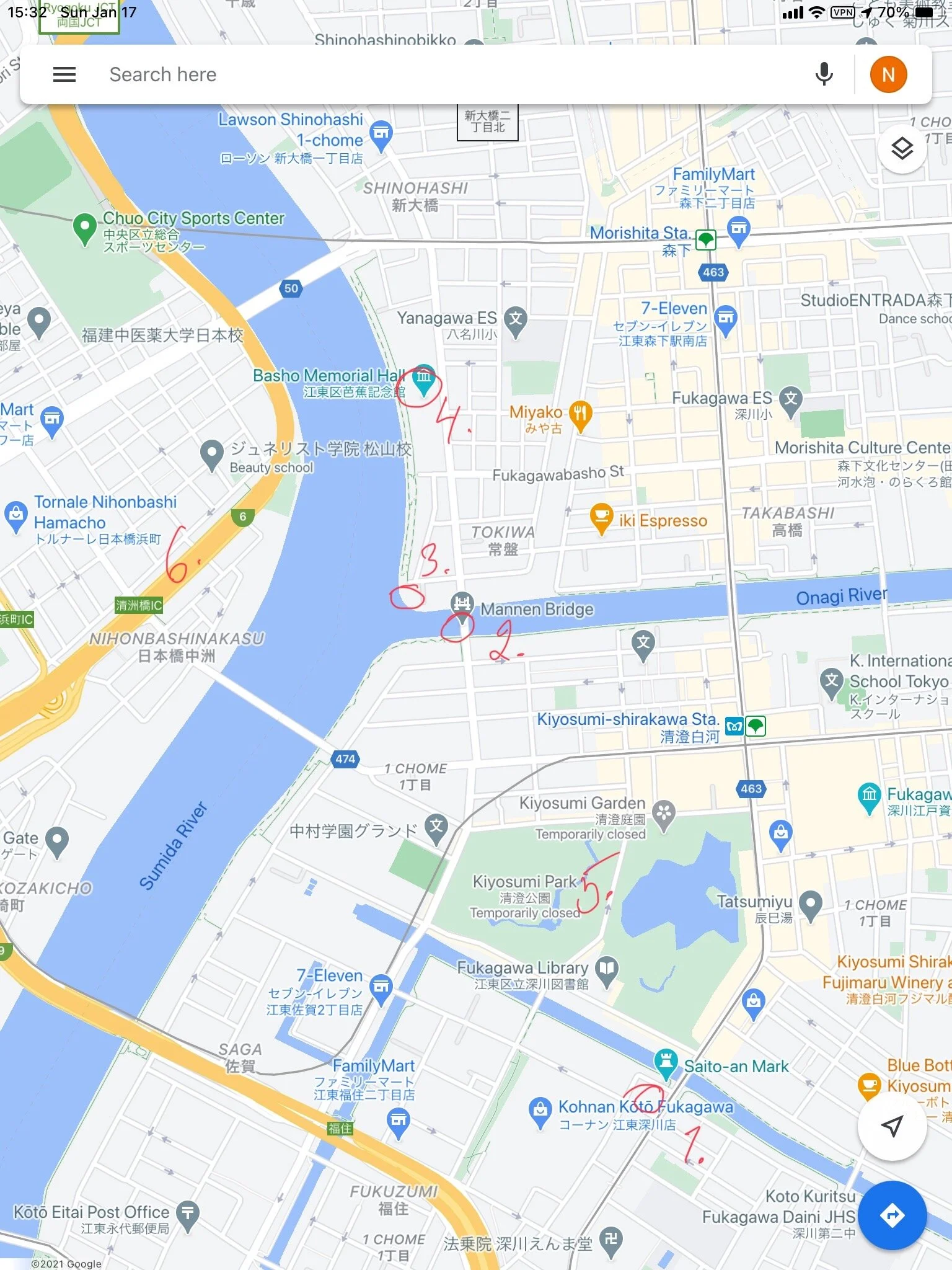 1. Basho började resan här. 2. Mannen-bron. 3. Ytterligare ett Basho-monument. Strålande utsikt över Sumida-floden. 4. Basho-museum. Inte mycket att se här. 5. Kiyosumi-parken , en landskapsträdgård värd ett besök. 6. Shuto motorväg.