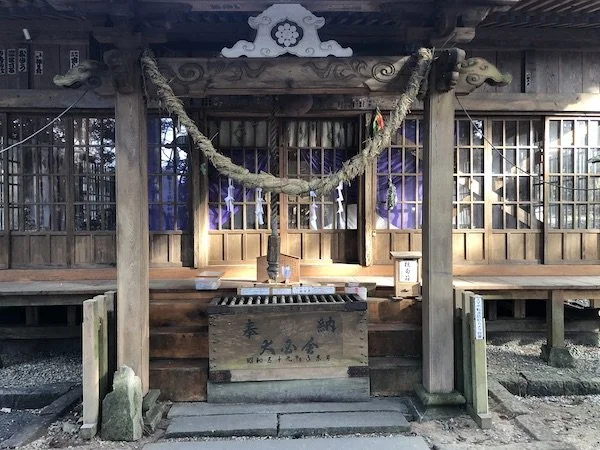 Så står jag inför trappstegen som leder upp till en rustik jinja (öppningsbilden). Jag donerar 100 yen och klappar två gånger i händerna som man skall. Här finns också en mossbevuxen minnessten med text jag inte förstår. Jag är på toppen av kullen och ser ut över något som ser ut som en ravin med kanske tre eller fyra meter ganska branta sidor.