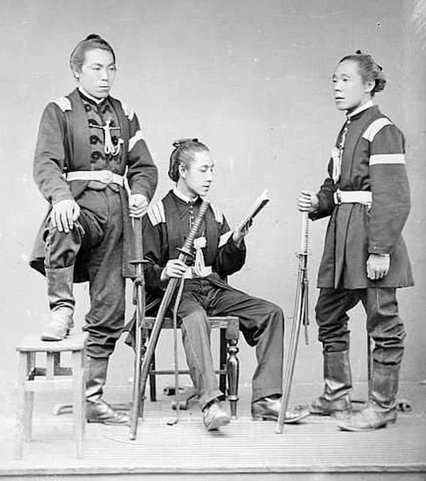 Samurajer under inbördeskriget 1868. Det framgår inte på vilken sida. Många har nu bytt kimono mot uniformer av västerländskt slag. Men svärden och den traditionella frisyren är kvar. Nytt är också att sitta på en stol i stället för på golvet — för att inte tala om att behålla skorna på inomhus.