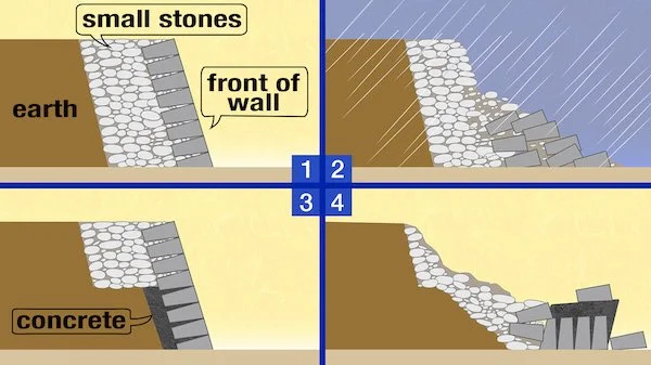 1. Murarna från 1630-talet bestod ursprungligen av jordvallar och stenar av olika storlek. 2. Häftiga regn under 1970-talet fick flera murar att rasa. 3. Under reparationsarbetet förstärktes de nedre delarna av dessa murar istället med cement. 4. Under den stora jordbävningen i norra Japan i mars 2011 kollapsade cementförstärkningen i ett enda gigantiskt stycke och drog med sig hela muren (Illustration NHK)