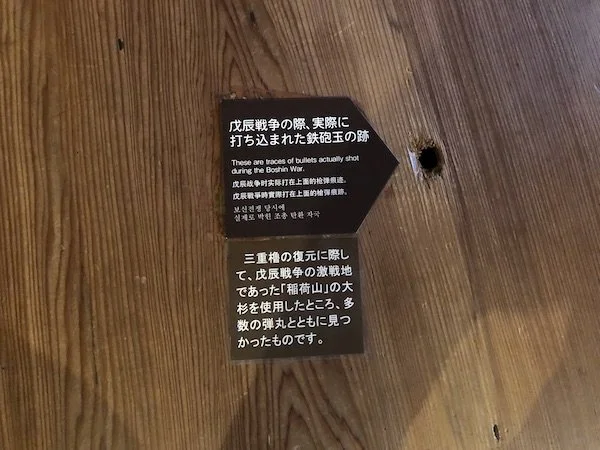 Jag är åter ensam på området, förutom kvinnan som dyker upp i porten in till tenshu, borgens torn. Inträdet är gratis och hennes uppgift verkar snarast vara att se till att besökarna tar av sig skorna innan de kliver upp på trägolvet. Men hon pekar också hjälpsamt ut de kraftiga plankorna med sina skotthål. Jag är en lättroad person och finner skotthål från 1868 intressanta. Jag tar en bild.