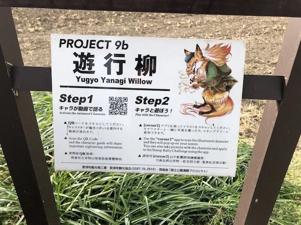 Jag parkerar vid en restaurang och en souvenirshop och fortsätter ett par hundra meter fram på stigar mellan risfälten. Numera finns här, natuligtvis, en tavla med information och en QR-kod med vilken man lyssna till storyn.